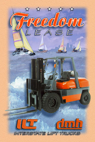 Freedom Lease Brochure This layout for International Lift Trucks was done for Fine Advertising in Independence, Ohio. They wanted to show the peace of mind that leasing from ILT would provide. The main imagery was created by pasting together a collage of photos in Photoshop and then scribbling over them in Fractal Design Painter. After that I ran the "water color" filter over the file to give it a painted look. It was reopened in Photoshop where the lift truck and shadow were added. The finished .tif file was imported into a page layout program where I added the logos and other type. The finished layout was printed in color on an inkjet printer. © Fine Advertising |
