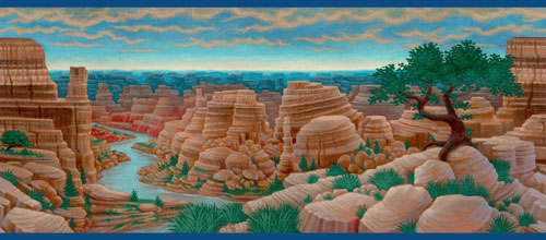 Canyon - Wallpaper Border Created for DLM Studio in Cleveland, Ohio. These are alot of fun to design since the two edges have to meet to create a continuous image. To offer variety in their product line, DLM would alter the color scheme of a painting to fit popular design trends. We would discuss this beforehand and come up with a middle ground to use as a starting point. The original art is around 10" x 24" - oil paint on unstretched canvas. |
