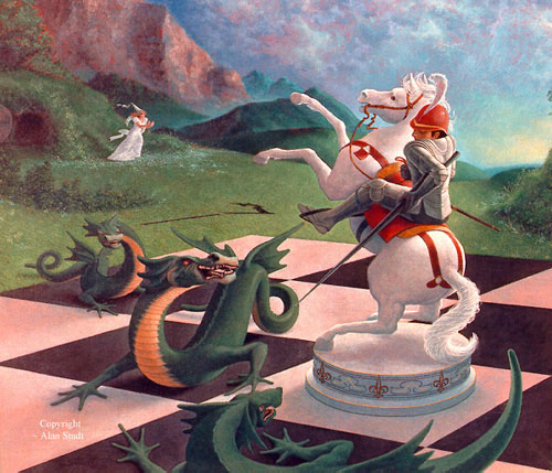Egersis: Saga of the Final Conflict Sounds a bit esoteric? I suppose it is. Egersis is a greek word that means "to stand up". In one instance in the New Testament it is translated "resurrection" in reference to Jesus'. I liked the sound of the word and it also reminded me of "Pegasus". So my head starts playing with the words and images and voila! You have a knight on a horse on a chess board representing the Ultimate calculated Victory of Good over evil that runs rampant without regard to rules of any kind. Original painting is 24" x 36" - oil on stretched canvas © Alan Studt |